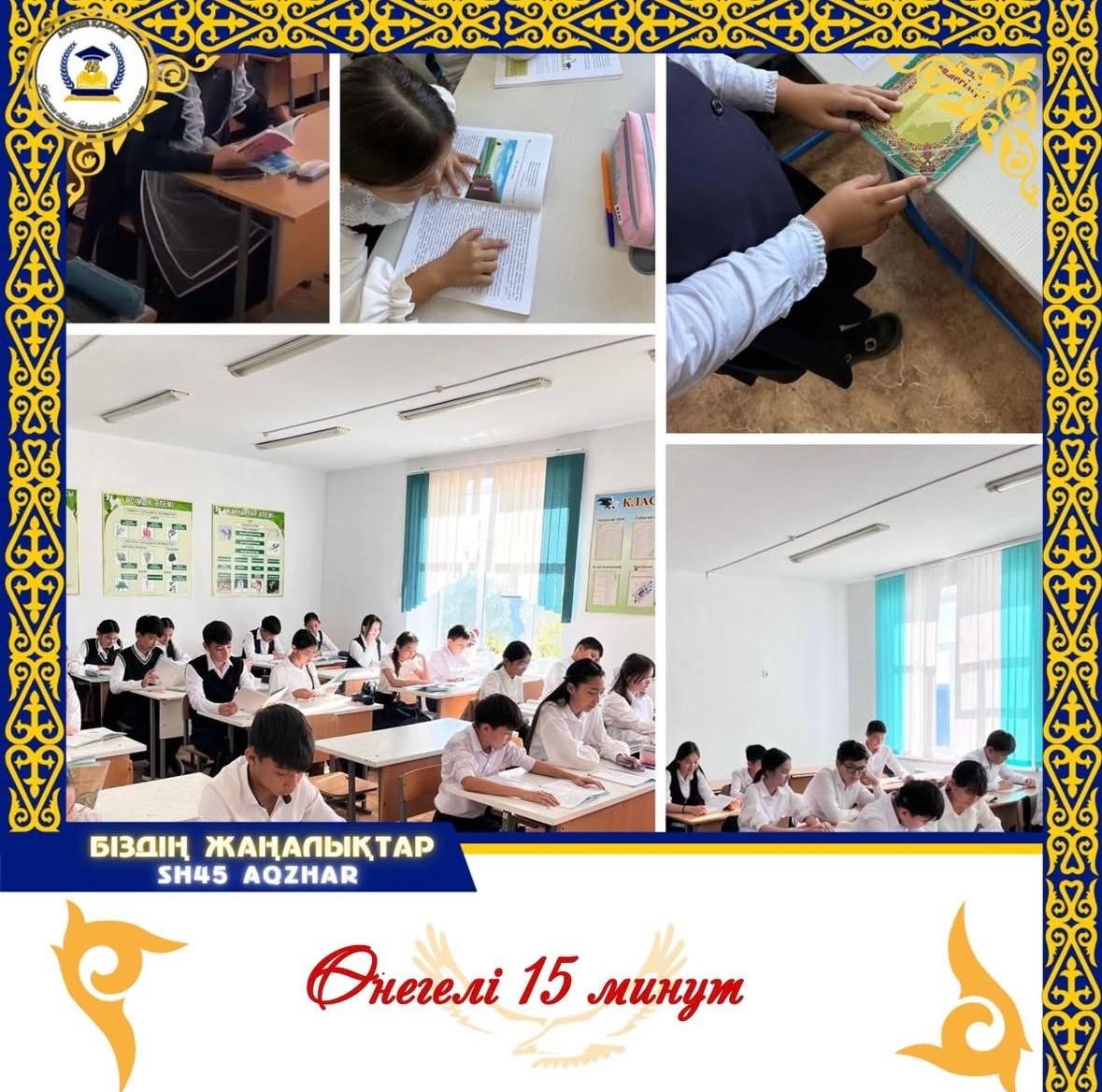 «Оқуға құштар мектеп» және «Балалар кітапханасы» және «Өнегелі 15минут» аясында қоңырау уақытын тиімді қйымдастыру мақсатында «Білім сарқылмас қазына, кітап ақылдың кілті» Барлығымыз бірге оыймызды оятып, қиялымызды тербететін 15 минуттық кітап оқу уақытына шақырамыз.